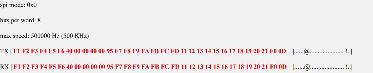 Затем закоротите контакты MOSI и MISO SPI1 и снова запустите spidev_test. Вы можете видеть, что отправленные и полученные данные совпадают, что указывает на то, что шлейф SPI исправен