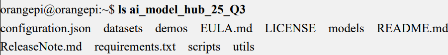 Следующая команда может загрузить полную библиотеку моделей. Параметр --local_dir загрузит библиотеку модели в /home/orangepi/ai_model_hub_25_Q3, которую можно изменить в соответствии с вашими потребностями.