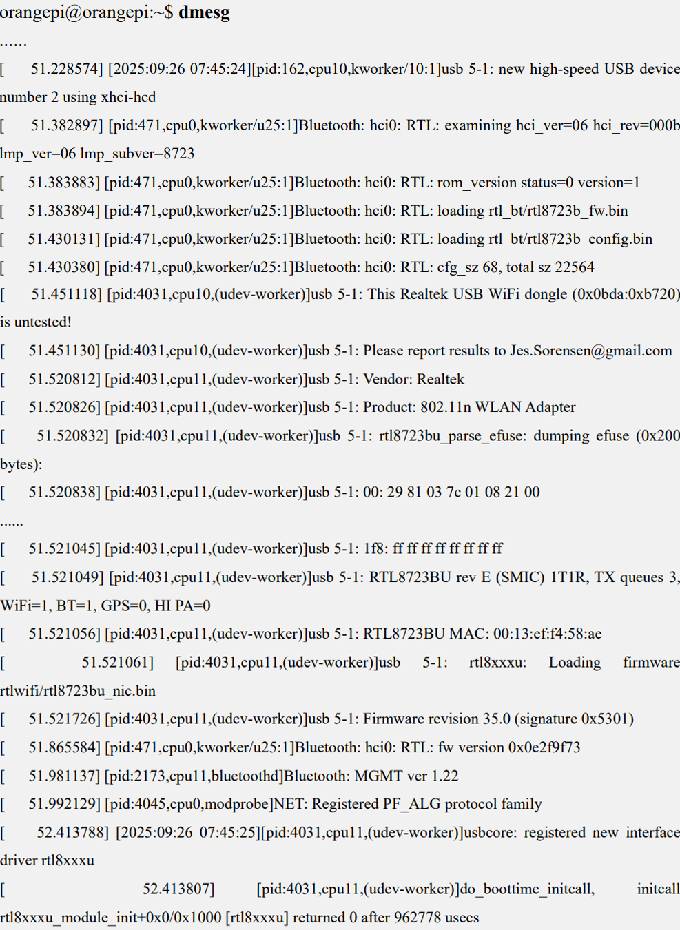 - Информацию о загрузке модуля RTL8723BU можно просмотреть через команду dmesg.