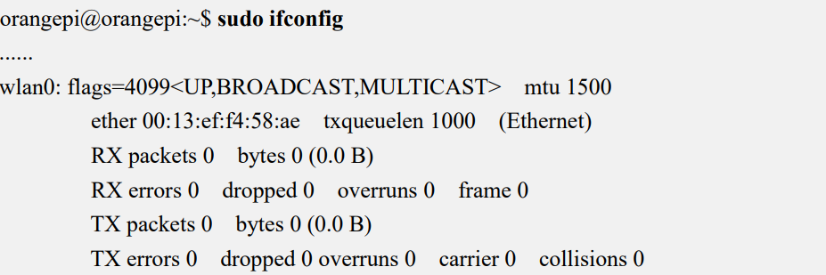 - Затем используйте команду sudo ifconfig, чтобы увидеть, статус подключения дополнительного сетевого устройства. Информацию о подключении Wi-Fi и методах тестирования см. в разделе Подключение Wi-Fi, который здесь не будет повторяться.